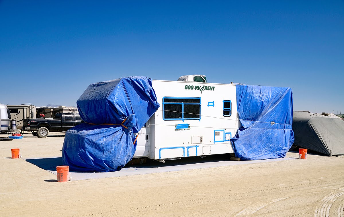Baker Beach's Man Camp sports a sign made of driftwood gathered on the birthplace of the event.